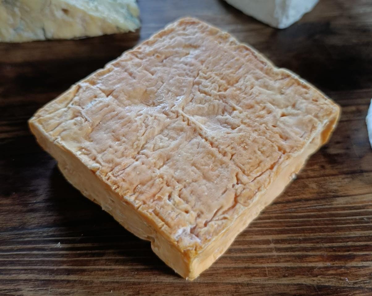 Nuestro queso de corteza lavada, con inspiración en el Taleggio. De aroma penetrante, que recuerda a carnes maduradas, establo y coles, corteza pegajosa, sabor intenso, salado y sensación adherente en boca, y textura granulada en un queso joven o cremosa en su versión madura.